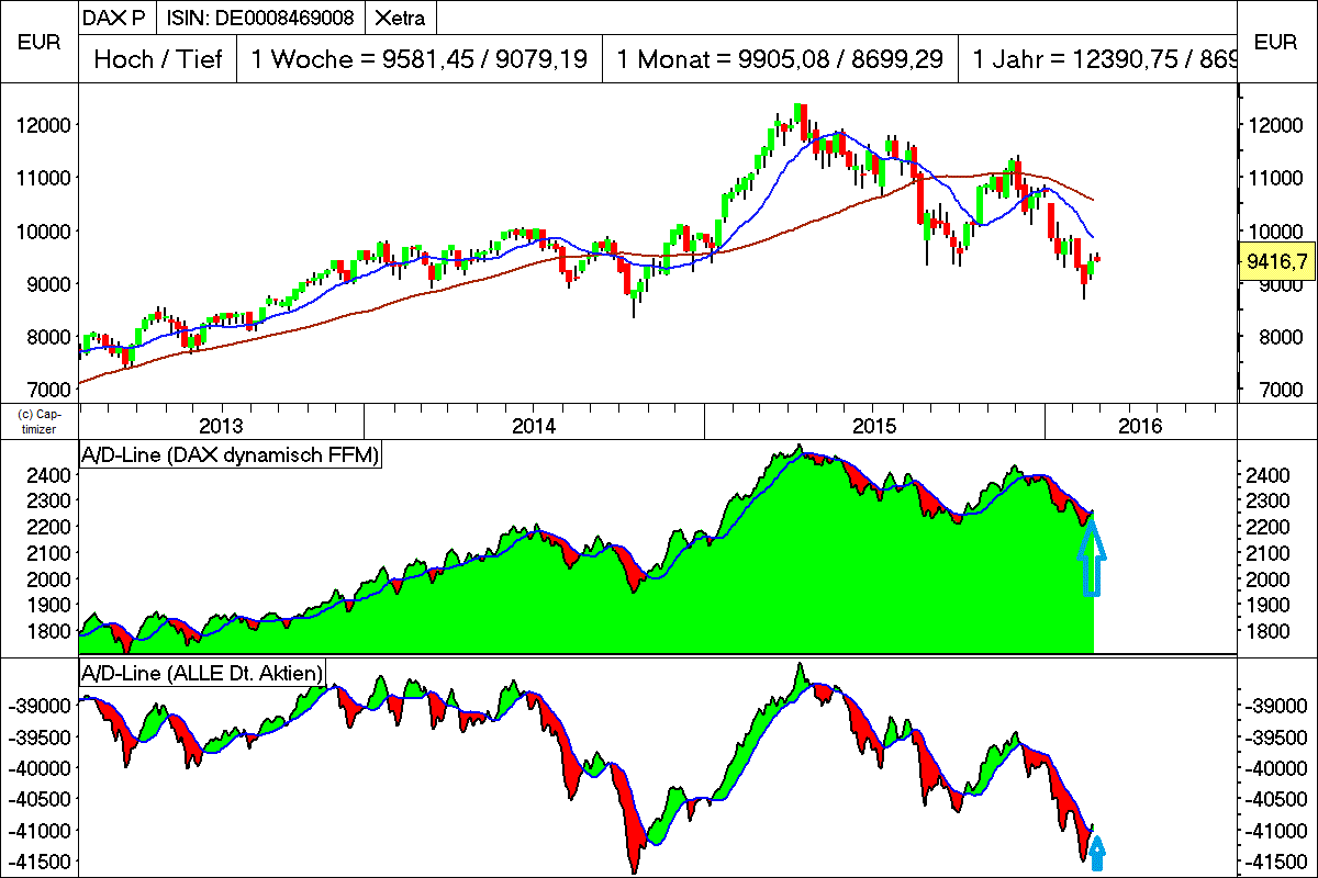 Στο διάγραμμα βλέπετε στην μέση τον τεχνικό δείκτη A/D για τον DAX και κάτω για όλες τις γερμανικές μετοχές. Από την άλλη δεν κατάφερε καν να πλησιάσει τον ΚΜΟ 52 ημερών. Είναι αυτό αδυναμία ή έλλειψη δύναμης?