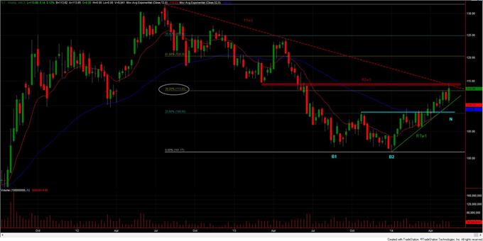 iShares 20 Year Treasury Bond: Μας προειδοποιεί η αγορά ομολόγων για κάτι; Ο Barclays Capital U.S. 20+ Year Treasury Bond Index (και το ETF iShares 20 Year Treasury Bond που τον ακολουθεί), μετρά την απόδοση των ομολόγων Η.Π.Α. με απομένουσα διάρκεια λήξης πλέον των 20 χρόνων. Κινείται αντίστροφα από την πορεία των επιτοκίων, ενισχυόμενος όταν τα τελευταία μειώνονται, ενώ εμφανίζει απώλειες όταν αυτά ανεβαίνουν. Και ενώ θα περίμενε κανείς ότι η σταδιακή απόσυρση από την FED των μέτρων ποσοτικής χαλάρωσης και η απρόσμενη εμφάνιση πληθωρισμού (βλέπε τελευταία στοιχεία), θα έβαζε τις τιμές των ομολόγων ¨για τα καλά¨ σε ένα καθοδικό κανάλι, το ETF ολοκλήρωσε τον σχηματισμό ανοδικής αντιστροφής ¨Διπλός Πάτος¨ (Β1,Β2) με κλείσιμο πάνω από τη Γραμμή Λαιμού, Ν, κινείται πάνω από την ανοδική γραμμή τάσης RTw1, ενώ από τις αρχές Μάιου δόθηκε το αγοραστικό σήμα Golden Cross (τιμή>γρήγορο ΜΟ>αργό ΜΟ).Πλέον, έχει προσεγγίσει το σημαντικό επίπεδο των $115, στο οποίο εντοπίζουμε την ισχυρή ζώνη αντίστασης RZw1, το επίπεδο διόρθωσης Fibonacci κατά 38.2% από τα υψηλά του 7/2012 έως τα χαμηλά του 1/2014 και την καθοδική γραμμή τάσης FTw1, η οποία όμως δεν είναι έγκυρη ακόμη. Κίνηση πάνω από τα $115 θα ανοίξει το δρόμο για την επαναδοκιμασία του υψηλού των $132.21 με μια στάση όμως πρώτα τα $124.26. Αντιθέτως, διάσπαση των $108.73, θα οδηγήσει το ETF στην στήριξη πέριξ των $100. Θα πρέπει να επισημάνουμε ότι η άρνηση των επενδυτών να αποχωριστούν την ασφάλεια των κρατικών ομολόγων έχει προβληματίσει πολλούς αναλυτές. Πρόκειται για ένα χαρακτηριστικό που θα αλλάξει στους επόμενους μήνες ή αποτελεί προειδοποιητικό σημάδι για επερχόμενες χρηματιστηριακές αναταράξεις; Ο χρόνος θα δείξει.