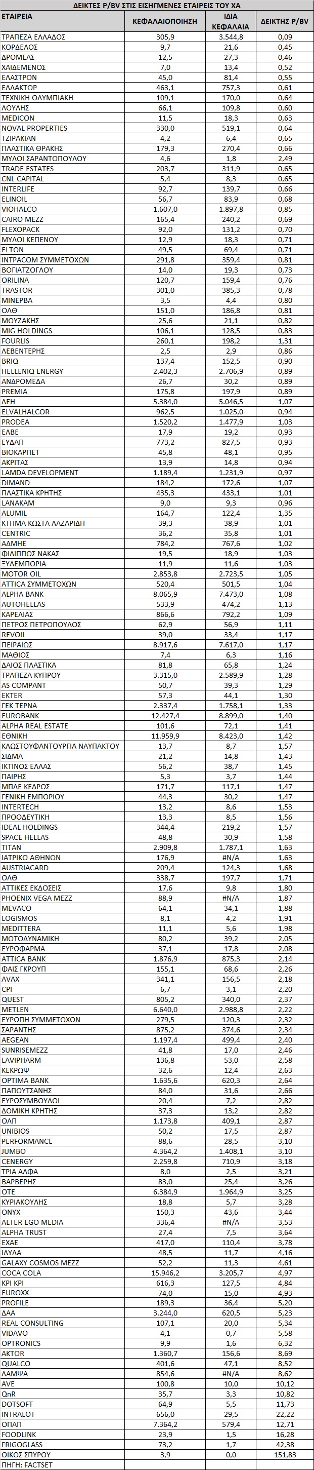 Προφανώς, ο δείκτης P/BV δεν αποτελεί πανάκεια και ούτε σημαίνει πως οι εισηγμένες εταιρείες με υψηλότερη τιμή του συγκεκριμένου δείκτη είναι υπερτιμημένες. Απλά, ο συνδυασμός μεγάλου αριθμού μετοχών κερδοφόρων εταιρειών που οι τρέχουσες χρηματιστηριακές τους αξίες υπολείπονται των ιδίων κεφαλαίων τους αποτελεί μια ένδειξη για το πόσο «ακριβά» ή «φτηνά» είναι αποτιμημένο το ΧΑ κατά την τρέχουσα περίοδο.