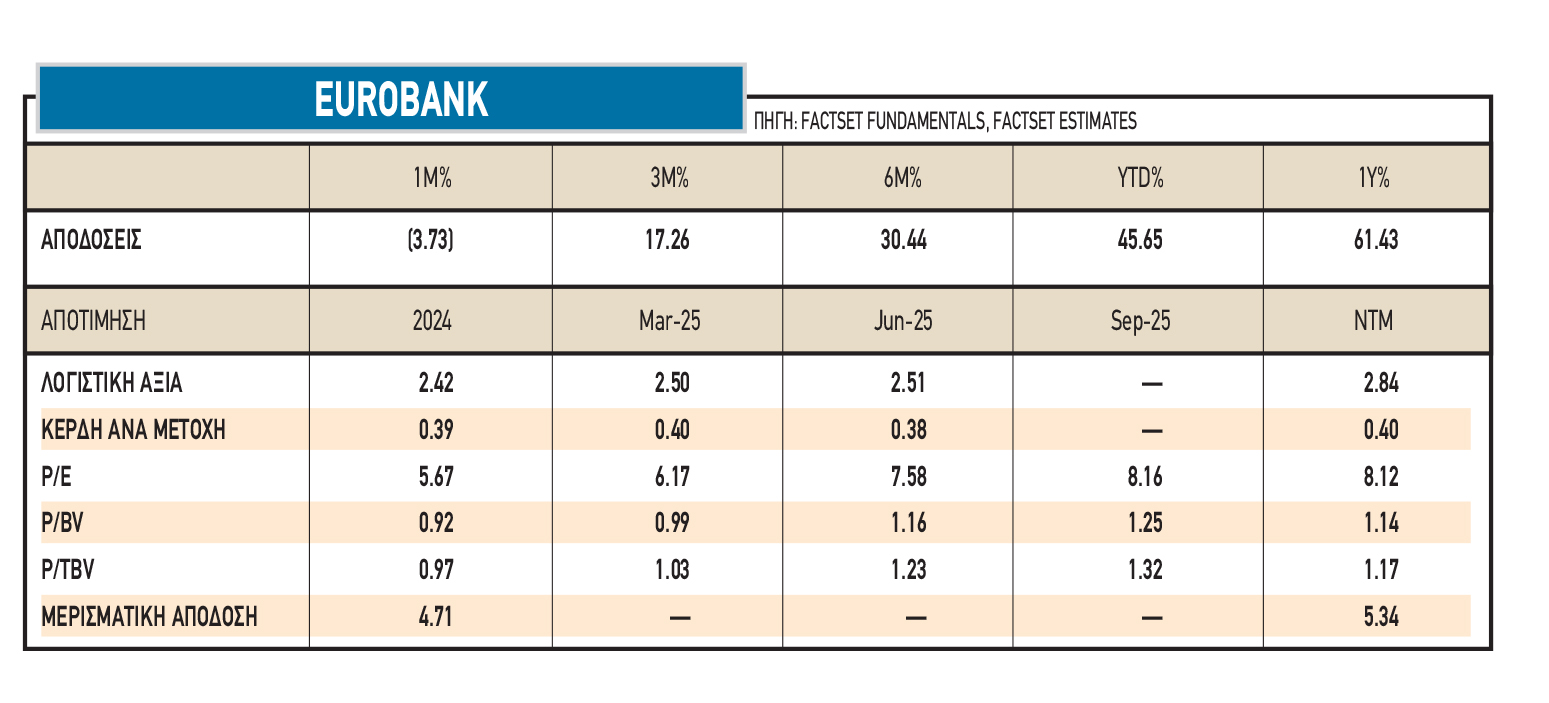 Η Bank of America εμφανίζεται ξεκάθαρα «ταύρος» για τον κλάδο, αλλά με διακριτές προτιμήσεις: για τη Eurobank ως κορυφαία επιλογή με νέα τιμή-στόχο 4,45 ευρώ (από 4,36), σύσταση Buy, που συνεπάγεται υψηλό δυνητικό περιθώριο ανόδου με βάση τα επίπεδα διαπραγμάτευσης.