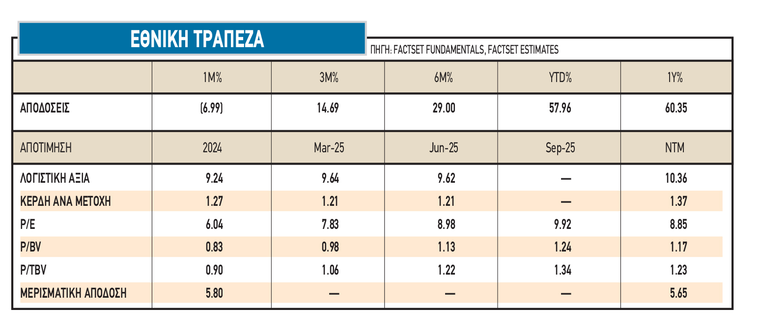 Ο δείκτης αποδοτικότητας ιδίων κεφαλαίων (RoTE) τοποθετείται στο 14,8% για το 2025, με βασικό μοχλό την πιστωτική επέκταση, ακόμη κι αν το καθαρό επιτοκιακό περιθώριο δεχθεί μικρές πιέσεις. Ο οίκος θεωρεί ότι τα θεμελιώδη παραμένουν ιδιαίτερα ελκυστικά και δίνει ισχυρές συστάσεις αγοράς.
