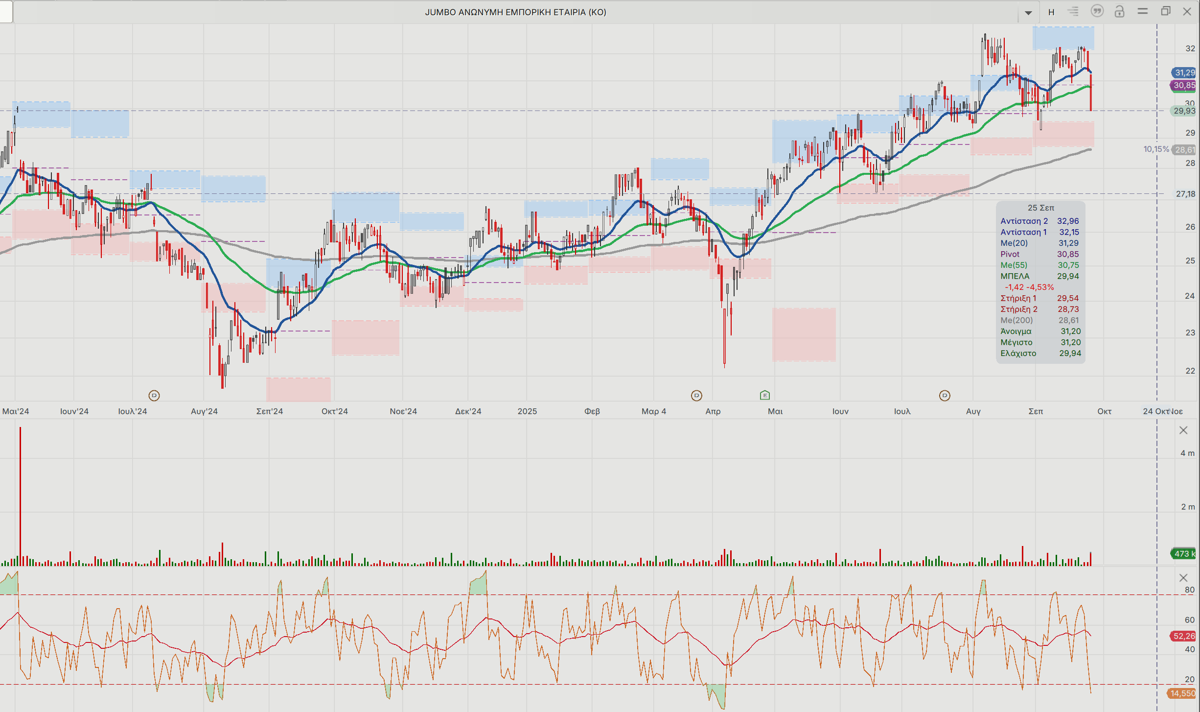 Σε τεχνικούς όρους, το διάγραμμα της μετοχής της Jumbο ήταν ο ορισμός της συσσώρευσης (accumulation), σε εβδομαδιαίο και ημερήσιο επίπεδο, με το range της μετοχής 22 ευρώ (low) έως τα 30,10 ευρώ (high) να «σπάει» τελικά ανοδικά.