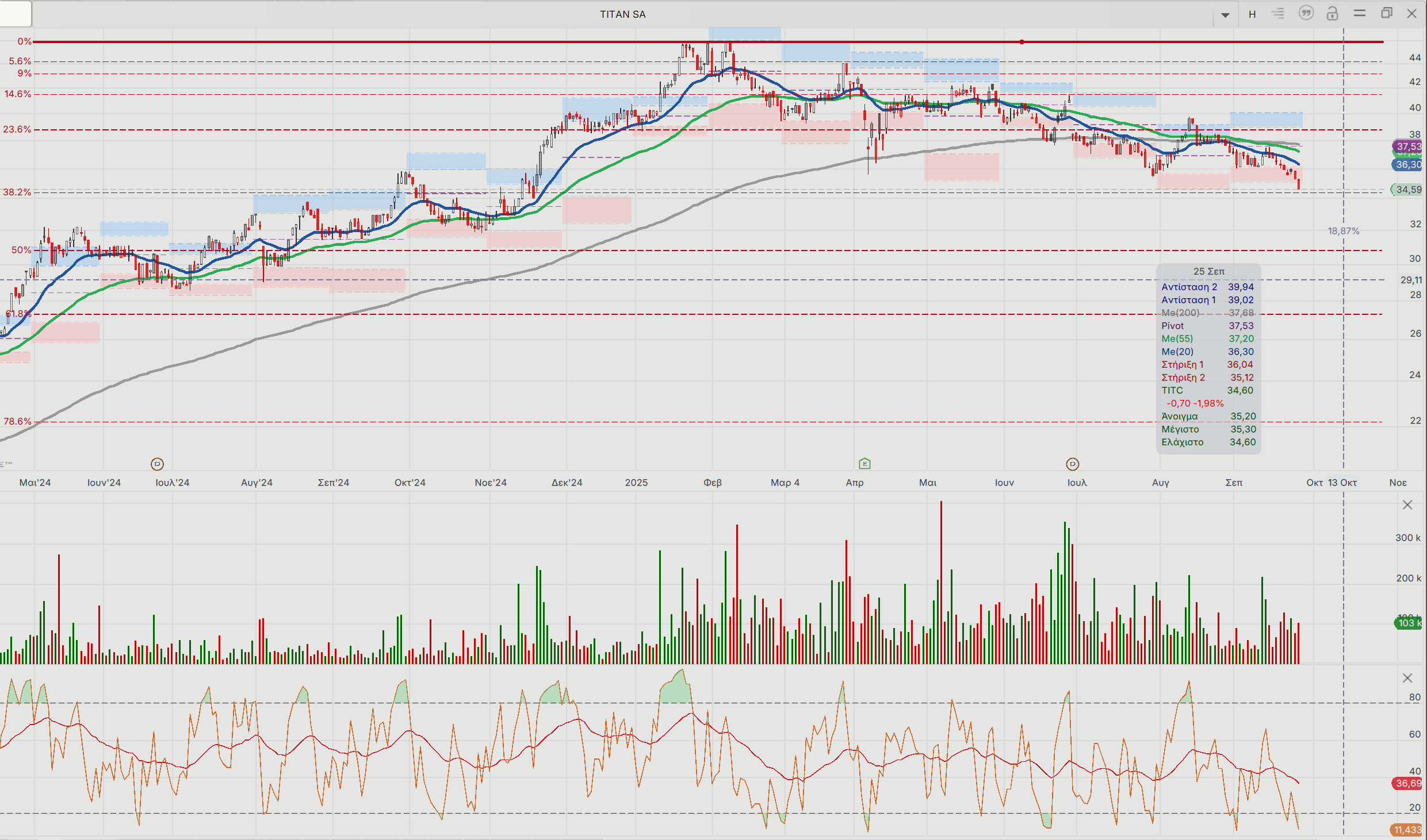 Η τιμή της μετοχής είναι διαπραγματεύσιμη με σημαντικό discount σε σχέση με τις ομοειδείς επιχειρήσεις σε Ευρώπη και ΗΠΑ. Επίσης έχει εισέλθει σε υπερπωλημένη περιοχή βάσει των ταλαντωτών RSI 14 ημερών και θα πρέπει να αντιδράσει. Από το μέγεθος της αντίδρασης θα κριθεί τεχνικά η πορεία στο ημερήσιο διάγραμμα.