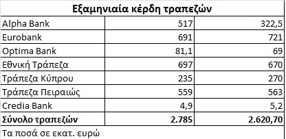 • Οι εισηγμένες τράπεζες διέψευσαν τις αρχικές εκτιμήσεις των αναλυτών για χαμηλότερη κερδοφορία λόγω της συρρίκνωσης του καθαρού επιτοκιακού επιτοκίου και ανέβασαν την επίδοσή τους κατά 6,3% (από τα 2,62 στα 2,785 δισ. ευρώ).