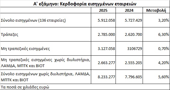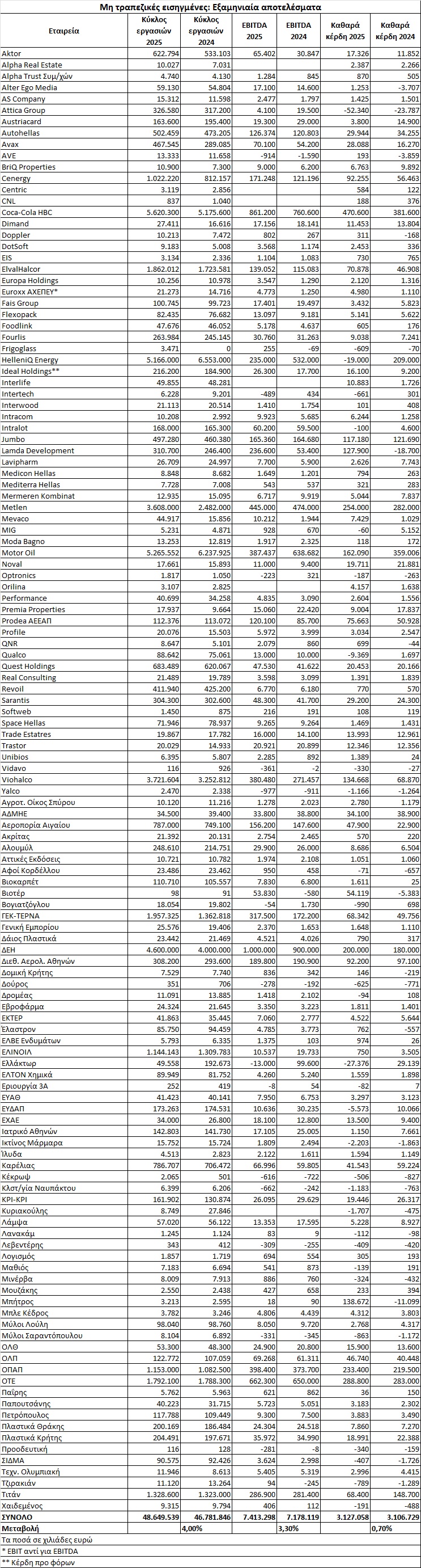 • 30 εταιρείες έκλεισαν το πρώτο εξάμηνο του 2025 με θετικό καθαρό ταμείο. Πρόκειται για τις Alpha Trust Συμμετοχών, Alpha Real Estate Services, Alter Ego Media, AS Company, Interlife, Jumbo, Performance Technologies, Profile, Softweb, ΑΔΜΗΕ, ΕΥΑΘ, ΕΥΔΑΠ, ΕΧΑΕ, Καρέλιας, ΚΡΙ-ΚΡΙ, ΟΛΘ, ΟΛΠ, Ελλάκτωρ, Τεχνική Ολυμπιακή, Centric, Πλαστικά Κρήτης, Intracom Συμμετοχών, Mevaco, EIS, Ίλυδα, Moda Bagno, Optronics, ΕΛΒΕ Ενδυμάτων, Mermeren Kombinat και Real Consulting.