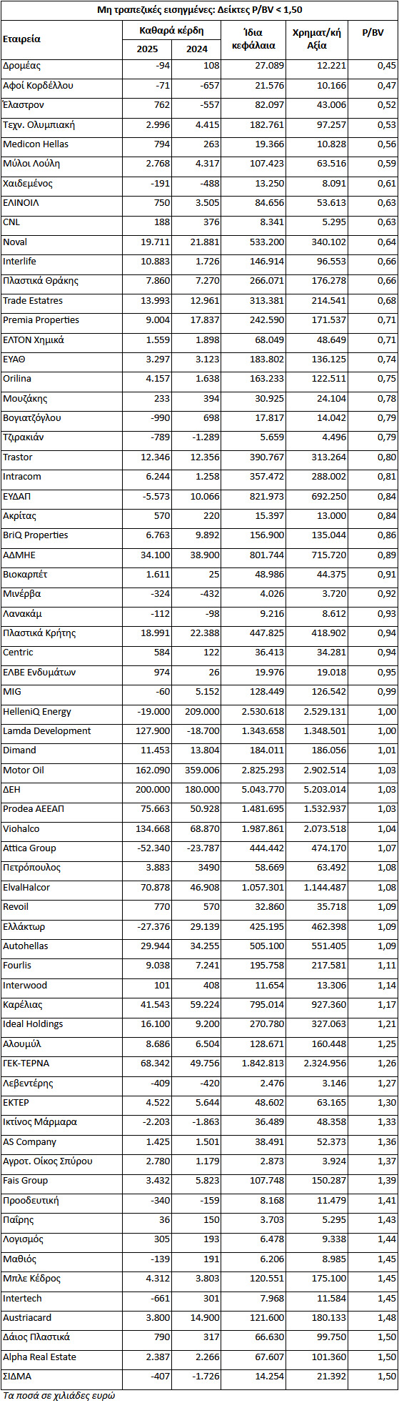 Σύμφωνα με τα ίδια κεφάλαια των εισηγμένων εταιρειών της 30ής Ιουνίου 2025 και το κλείσιμο τιμών της 7ης Οκτωβρίου, 35 μη τραπεζικές εισηγμένες εταιρείες διαπραγματεύονταν με δείκτη P/BV χαμηλότερο της μονάδας, 11 με δείκτη μεταξύ 1,01 και 1,10 και άλλες 21 με δείκτη μεταξύ 1,11 και 1,50 (βλέπε στοιχεία παρατιθέμενου πίνακα).