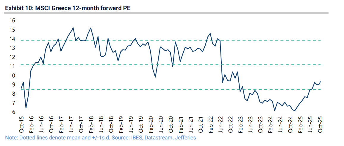 Οι τέσσερις συστημικές τράπεζες αντιπροσωπεύουν πλέον το 69% του MSCI Greece και έχουν δει τις μετοχές τους να αυξάνονται κατά 390% μέσα στην τελευταία τριετία. Το re-leveraging της οικονομίας, κατά τον οίκο, «έχει μόλις ξεκινήσει»: ο δείκτης καθαρές υποχρεώσεις/EBITDA για τις εισηγμένες είναι 0,45 φορές, ενώ η προβλεπόμενη απόδοση ιδίων κεφαλαίων (ROE) φθάνει το 14,6% για το 2025.