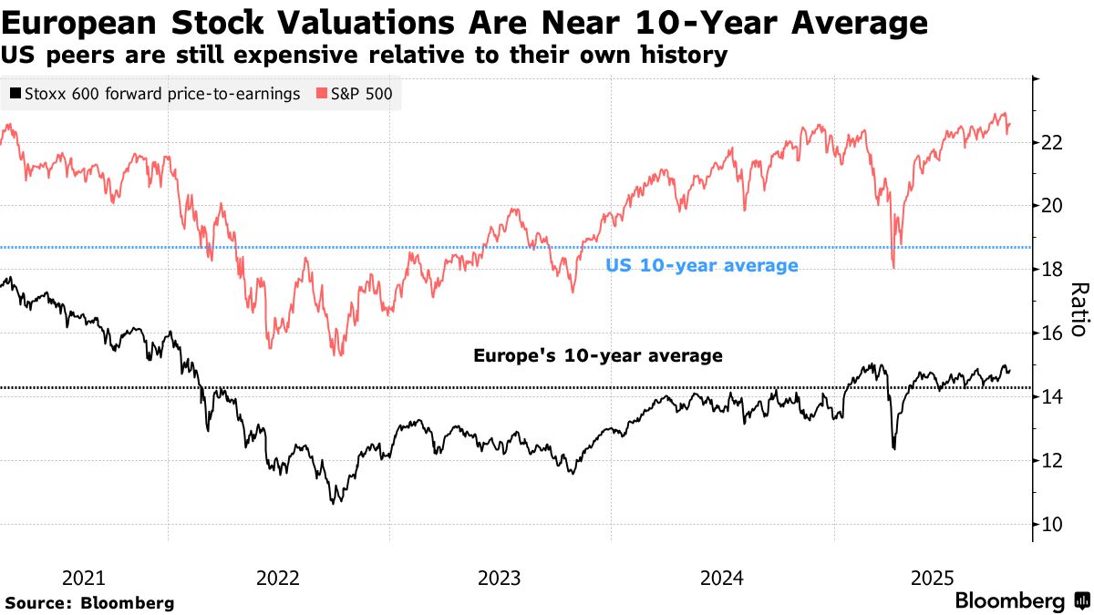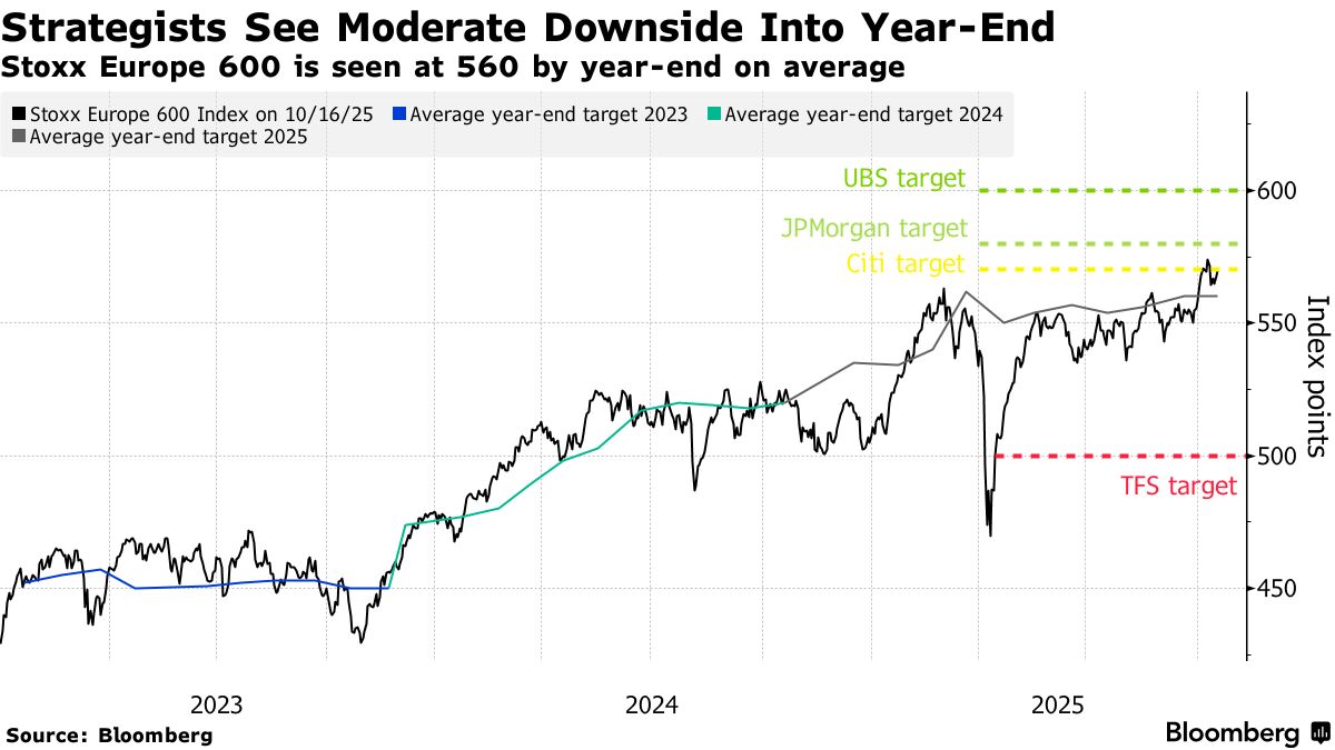 Η ευρωπαϊκή αγορά είναι ιδιαίτερα συνδεδεμένη με την υγεία της αμερικανικής οικονομίας, καθώς οι βιομηχανίες της, όπως οι μεταλλευτικές και οι αυτοκινητοβιομηχανίες, αποτελούν μέρος της παγκόσμιας εφοδιαστικής αλυσίδας. Οι αναλυτές που παρακολουθεί το Bloomberg Intelligence προβλέπουν μια μικρή μείωση στα κέρδη του Stoxx 600 για το 2025, πριν από μια άνοδο 11% το επόμενο έτος.