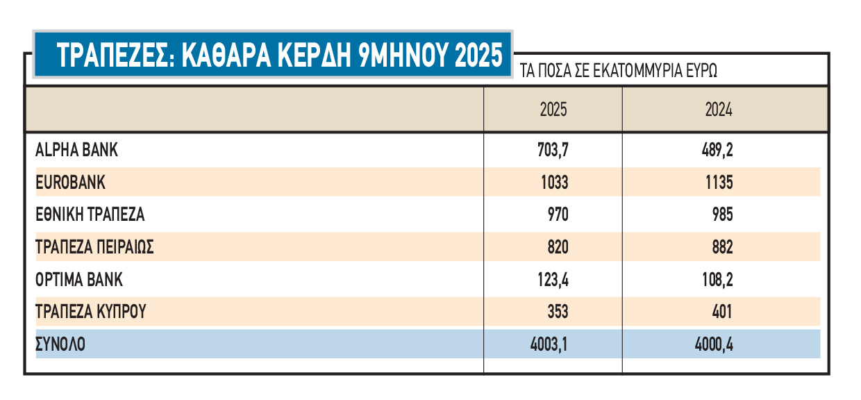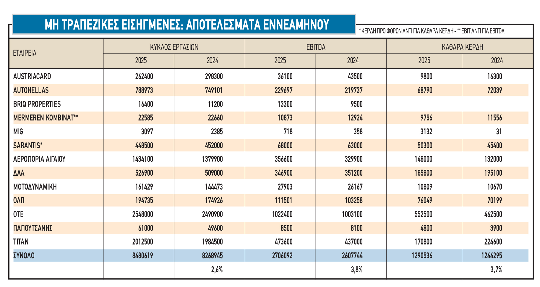 Σε ότι αφορά τις εισηγμένες (βλέπε σχετικούς πίνακες με τις επιδόσεις εννεαμήνου τραπεζών και εταιρειών άλλων κλάδων) όλα δείχνουν πως τα φετινά εταιρικά κέρδη θα κινηθούν αρκετά κοντά στα αντίστοιχα περυσινά (πράγμα που θεωρείται ως θετική εξέλιξη με βάση το εξαιρετικό επίπεδο του 2024), με τους αναλυτές να προβλέπουν την άνοδό τους το 2026.