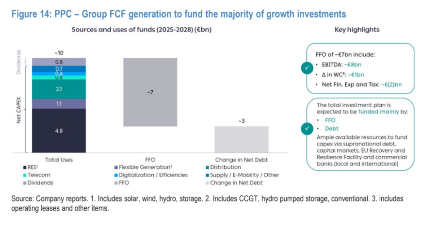 Η JP Morgan υπογραμμίζει ότι τα 10,1 δισ. ευρώ επενδύσεων για την περίοδο 2026-2028 θα είναι κατά κύριο λόγο αυτοχρηματοδοτούμενα, καθώς η λειτουργική κερδοφορία και οι ταμειακές ροές επαρκούν για να καλύψουν το μεγαλύτερο μέρος του προγράμματος. Στο γράφημα της σελίδας 6, η εικόνα του FCF δείχνει καθαρά ότι η εταιρεία στοχεύει σε διατήρηση του δείκτη καθαρού δανεισμού προς EBITDA κάτω από 3,5 φορές έως το 2028.