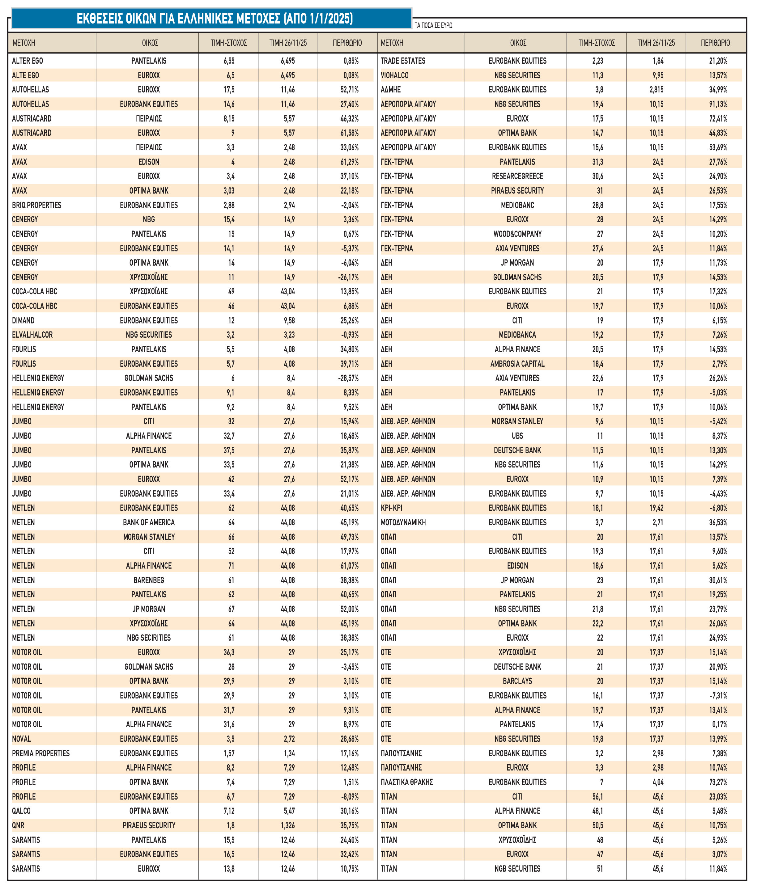 Ενδεικτικά είναι τα στοιχεία του παρατιθέμενου πίνακα, στον οποίον παρουσιάζονται οι τιμές-στόχοι που δόθηκαν στις φετινές εκθέσεις των αναλυτών για διψήφιο αριθμό μη τραπεζικών εισηγμένων, με τις πλέον πρόσφατες εκθέσεις να βρίσκονται ψηλότερα στον πίνακα και τις παλαιότερες χαμηλότερα. Όπως φαίνεται, πολύ συχνά οι πιο πρόσφατες εκθέσεις οδηγούν σε υψηλότερες τιμές-στόχους. Επίσης, οι όποιες αναθεωρήσεις τιμών-στόχων γίνονται από τους αναλυτές, κινούνται προς τα πάνω στις πλείστες των περιπτώσεων.