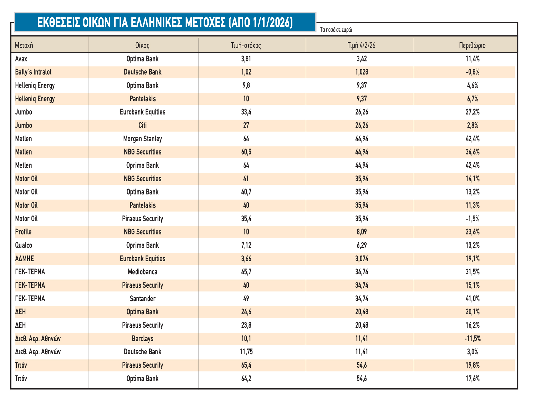 Δεν είναι τυχαίο ότι οι αναλυτές έχουν ανεβάσει κατακόρυφα τις τιμές-στόχους σε σχέση με πέρυσι (π.χ. Avax από τα 3,03 στα 3,81 ευρώ, Motor Oil από τα 28 στα 41 ευρώ, Profile από τα 6,7 στα 10 ευρώ, ΓΕΚ ΤΕΡΝΑ από τα 27 στα 45-49 ευρώ, κ.λπ.).