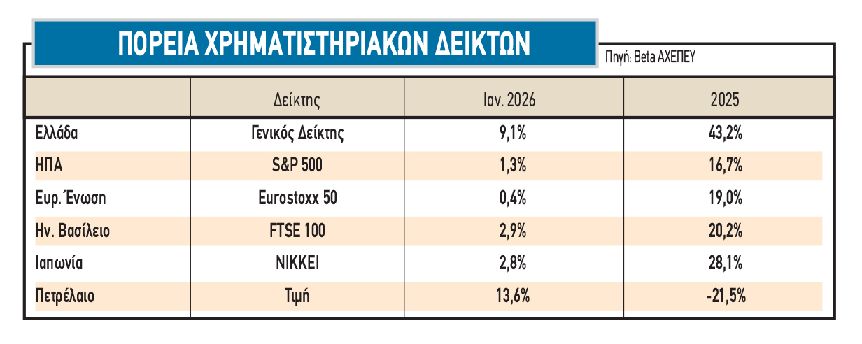 Πρώτον, να ξεχάσουν τις τρελές αποδόσεις του 2025 (+43,2%, όπως προκύπτει από τα στοιχεία του παρατιθέμενου πίνακα) και του φετινού Ιανουαρίου (+9,1%), καθώς τέτοιες μεταβολές δεν μπορούν να συνεχίζονται επ’ άπειρον και μάλιστα σε περιόδους χαμηλών επιτοκίων.