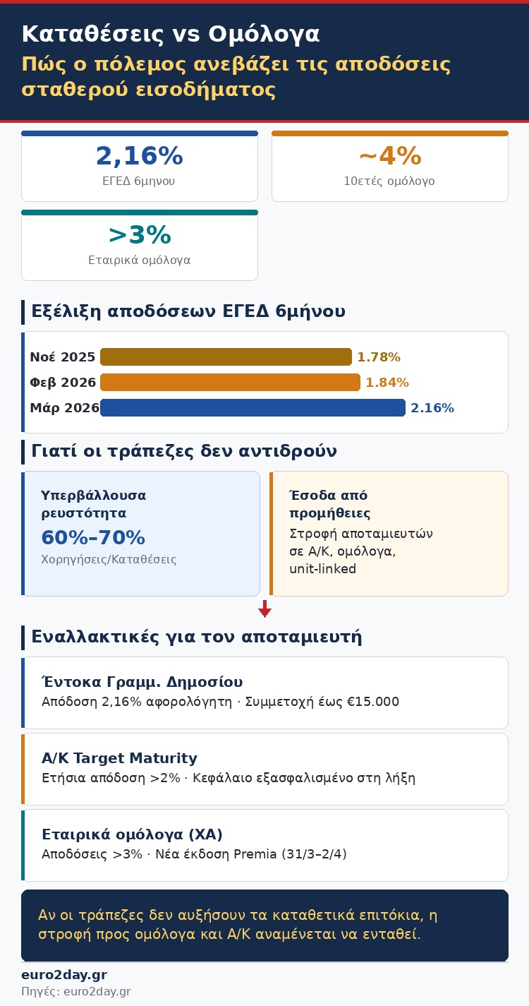 Η υπερβάλλουσα ρευστότητα που χαρακτηρίζει τις ελληνικές τράπεζες έχει ως αποτέλεσμα να μην έχουν αυξηθεί κατά τη διάρκεια των πολεμικών συρράξεων στη Μέση Ανατολή τα καταθετικά τους επιτόκια, σε αντίθεση με τις αποδόσεις (yields) των ανταγωνιστικών τους επενδύσεων σταθερού εισοδήματος.