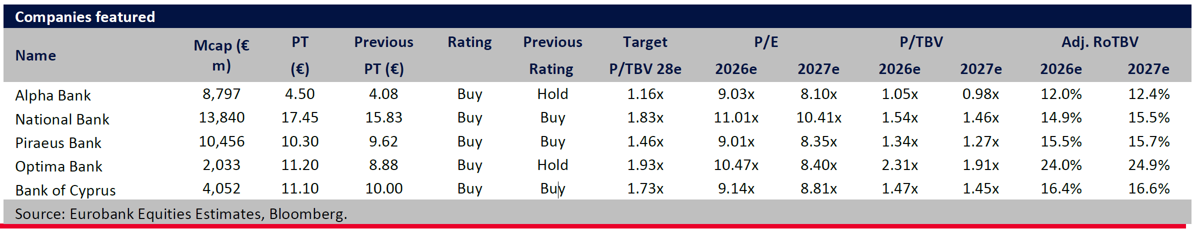 Η χρηματιστηριακή διατηρεί σύσταση «αγορά» για το σύνολο του κλάδου, με τιμές-στόχους στα 4,50 ευρώ για την Alpha Bank, στα 17,45 ευρώ για την Εθνική Τράπεζα, στα 10,30 ευρώ για την Τράπεζα Πειραιώς, στα 11,20 ευρώ για την Optima Bank και στα 11,10 ευρώ για την Τράπεζα Κύπρου, υπογραμμίζοντας ότι η σχέση ρίσκου και απόδοσης παραμένει ελκυστική ακόμη και μετά το πρόσφατο ράλι. Οι συστάσεις είναι όλες «αγορά», ενώ αυξάνει τη σύσταση σε Apha Bank και Optima Bank σε «buy» από «hold».