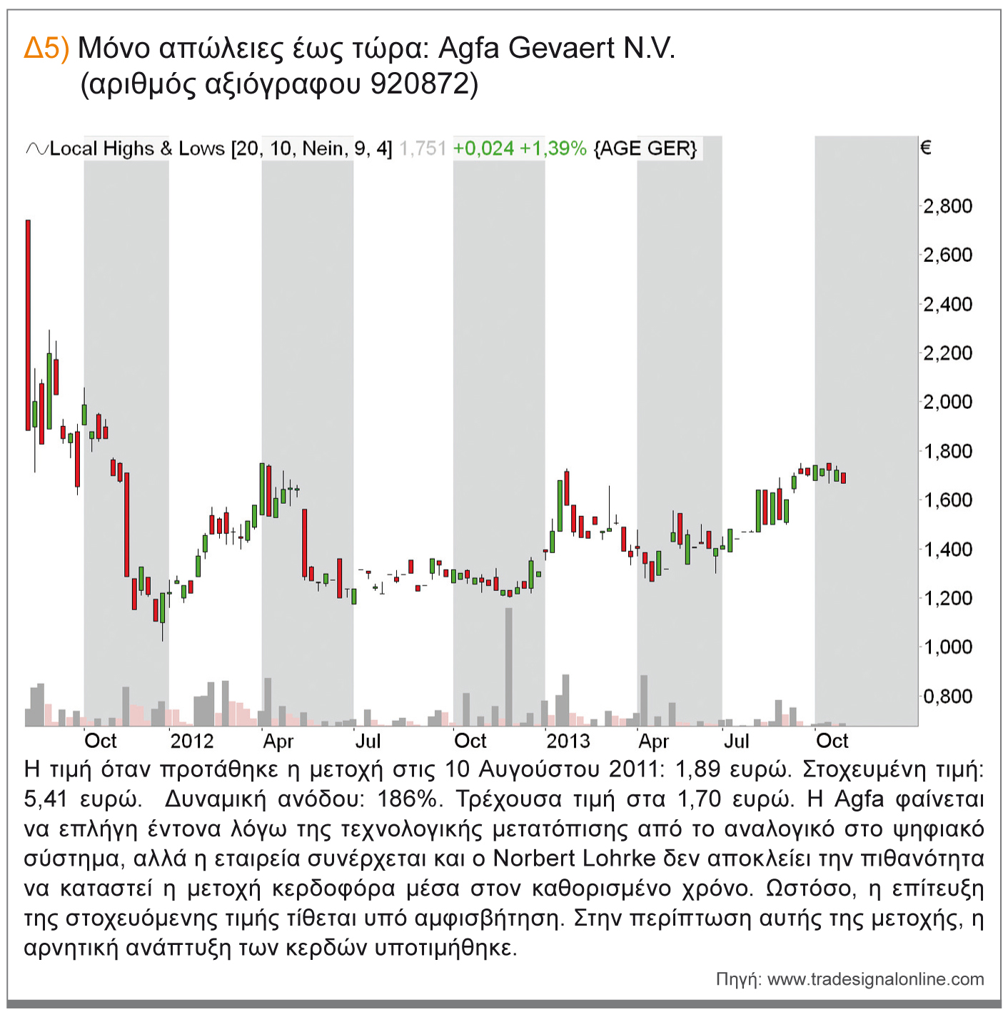 ε) Agfa Gevaert N.V. (αριθμός αξιόγραφου 920872): η τιμή όταν προτάθηκε η μετοχή στις 10 Αυγούστου 2011: 1,89 ευρώ. Στοχευμένη τιμή: 5,41 ευρώ. Δυναμική ανόδου: 186%. Τρέχουσα τιμή στα 1,70 ευρώ. Η Agfa επλήγη έντονα λόγω της τεχνολογικής μετατόπισης από το αναλογικό στο ψηφιακό σύστημα, αλλά η εταιρεία συνέρχεται και δεν αποκλείω την πιθανότητα να καταστεί η μετοχή κερδοφόρα μέσα στον καθορισμένο χρόνο. Στην περίπτωση αυτής της μετοχής, η αρνητική ανάπτυξη των κερδών υποτιμήθηκε. Η επίτευξη της στοχευόμενης τιμής τίθεται υπό αμφισβήτηση. στ) Mühlbauer Holding AG (αριθμός αξιόγραφου 662720): η τιμή όταν προτάθηκε η μετοχή στις 14 Ιουλίου 2011: 31,59 ευρώ. Στοχευμένη τιμή: 45,56 ευρώ. Δυναμική ανόδου: 44%. Τρέχουσα τιμή στα 20 ευρώ. Μέσα στην ιδιαίτερα ευμετάβλητη και από άποψη τιμών επιθετική βιομηχανία των ημιαγωγών, η Mühlbauer είναι μια σχετικά μικρή εταιρεία με μια αντίστοιχα χαμηλή κεφαλαιοποίηση αγοράς. Αυτό καθιστά δύσκολο για την εταιρεία να ανταποκρίνεται, αναγκάζοντας την να είναι πιο τρωτή. Εντούτοις, δεν αποκλείω τη πιθανότητα η τιμή που αναφέρθηκε κατά την διάρκεια της πρότασης τουλάχιστον να ξεπεραστεί εντός της τετραετούς περιόδου που καθορίσαμε οι ίδιοι. Όσον αφορά τις μετοχές για τις οποίες η επενδυτική ιδέα δεν υπήρξε αποδοτική, μπορούμε να πούμε ότι οι απώλειες που καταγράφηκαν αντισταθμίζονται με το παραπάνω από τις πετυχημένες μετοχές. Θέλουμε επίσης να επισημάνουμε ότι τα κριτήρια επιλογής είναι τόσο καλά ώστε μπορέσαμε να αποφύγουμε καθολικές αποτυχίες παρόλη τη φαινομενικά μακρά περίοδο των τεσσάρων ετών που ορίσαμε, γεγονός που αρχικά εκπλήσσει αλλά συγχρόνως αποδεικνύει ότι η προσέγγιση έχει λογική.